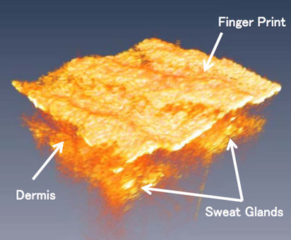 The rigid endoscope enables the acquisition of 3 dimensional images by combing the KTN optical scanner that capture the surface of the affected area in a planar manner, and the OCT that can observe living tissue in the depth direction of affected part with high definition. A lens with a diameter of 7mm and a length of 53mm is attached to the tip of the rigid endoscope to deliver laser light into the body. Imaging the affected part can be done by inserting this lens into the body from a small opening on the body surface. This time, however, we could acquire 3 dimensional images from the surface of the human finger without actually inserting the lens into the body. We were able to sufficiently image complicated internal structures such as sweat glands and dermis, so that a practical level of resolution was obtained (Fig. 2).